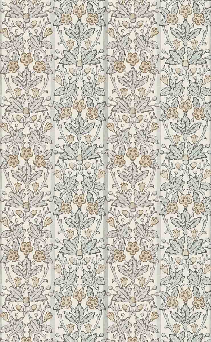 La carta da parati Oak & Blossom mette in scena una composizione verticale di grande ricchezza, tipica dello stile Arts & Crafts. Le foglie di quercia si intrecciano in arabeschi ritmati, punteggiati da ghiande e fiori stilizzati, organizzati in colonne ornamentali. Il motivo rivela un sottile equilibrio tra rigore geometrico e abbondanza vegetale. Morris and Co firma questa interpretazione, rendendo un vibrante omaggio alla natura strutturata.
