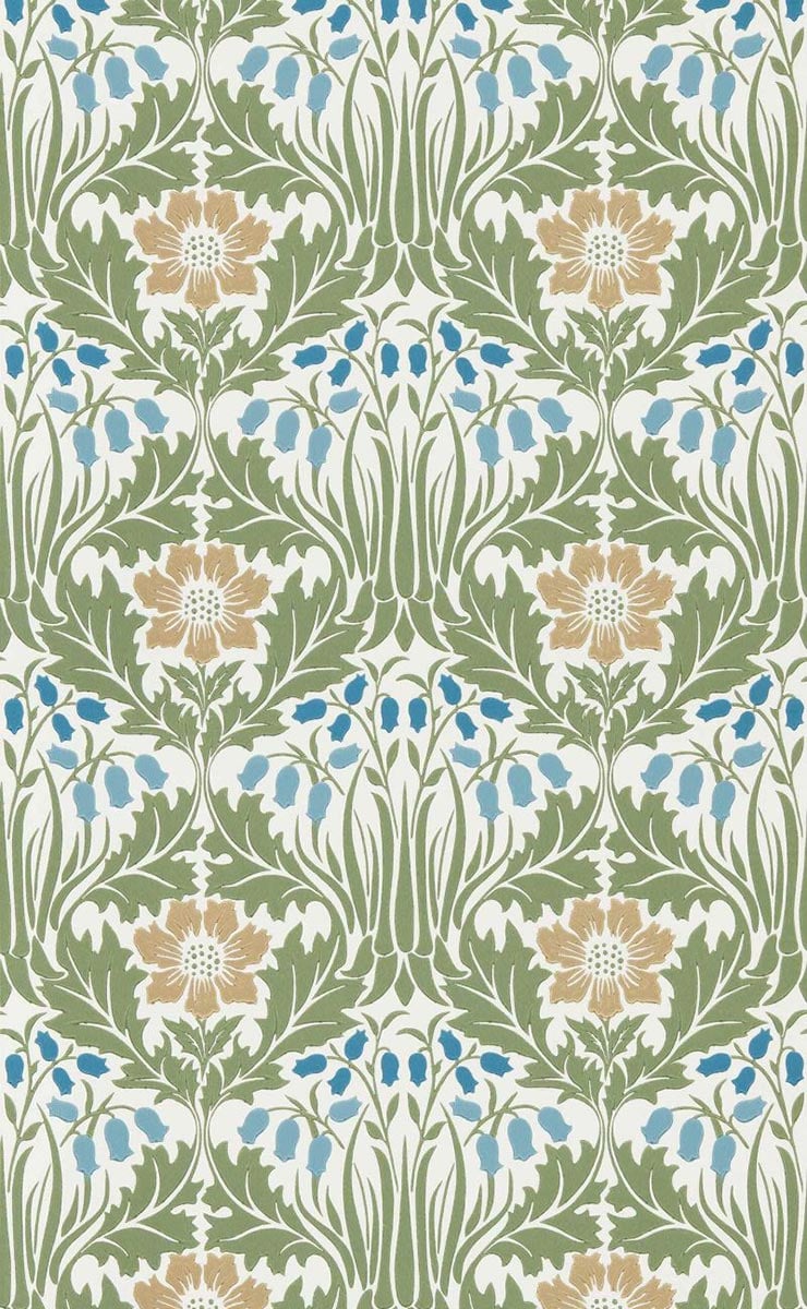 Grandi anemoni con petali arrotondati sbocciano tra steli morbidi, accompagnati da grappoli di campanule delicatamente inclinate. La carta da parati Woodbell & Anemone presenta un motivo floreale armonioso, in cui ogni forma vegetale si integra in una composizione misurata. Le foglie slanciate, finemente dentellate, si ergono in fasci verticali e disegnano una sequenza ritmica. Morris and Co crea una superficie ricca, dove la ripetizione dà una sensazione di continuità e movimento.