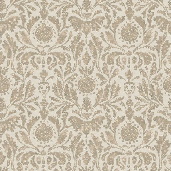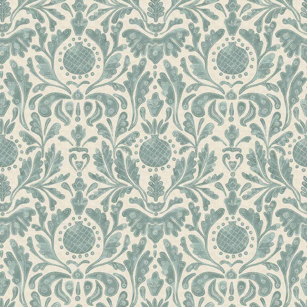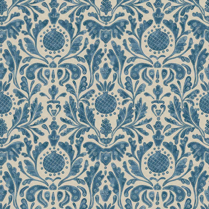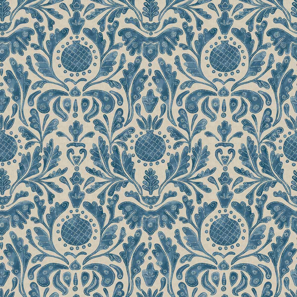Castellane presenta un motivo damascato vegetale in cui la forma stilizzata della melagrana dialoga con un fogliame ornamentale. Questa carta da parati disegnata da Nina Campbell presenta una simmetria decorativa ispirata ai tessuti antichi. Ogni elemento è sottolineato da piccoli pois che strutturano lo spazio con finezza. L'insieme evoca una composizione floreale simbolica, densa e raffinata.