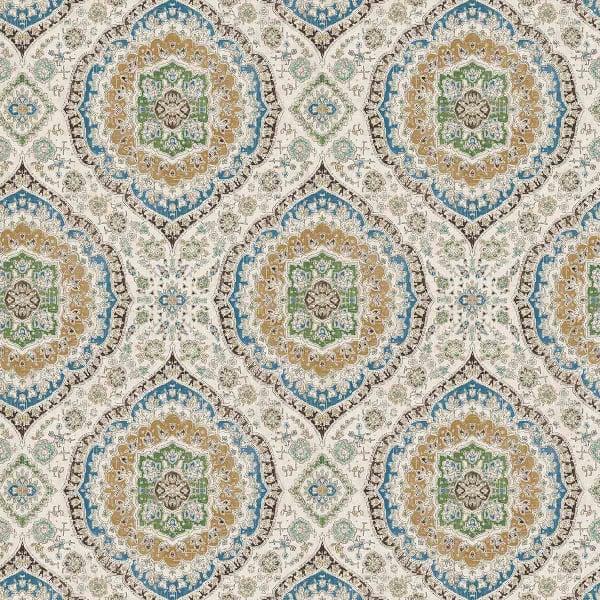 Karabali è una carta da parati strutturata attorno a un motivo a medaglione di ispirazione persiana. Ogni elemento è ricco di dettagli, tra composizioni floreali stilizzate e figure geometriche cesellate. La disposizione regolare forma una superficie ritmica, simile a un mosaico raffinato. Nina Campbell restituisce qui lo spirito delle tradizioni decorative orientali con un'eccellente precisione grafica.
