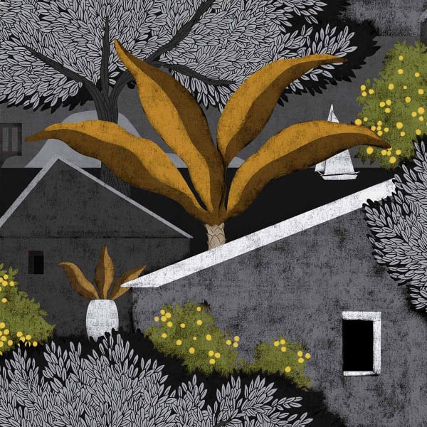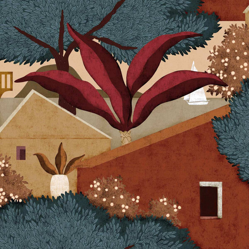 Un motivo paesaggistico si estende sulla carta da parati Nopolo immaginata da Coordonné. Come un'opera architettonica, un villaggio dalle facciate colorate, inondato di luce, evoca un deserto tranquillo. Una fitta vegetazione, composta da cactus giganti, alberi massicci e piante esotiche, struttura l'insieme in un equilibrio grafico. Questo rivestimento forma una scena senza tempo dalle texture morbide.