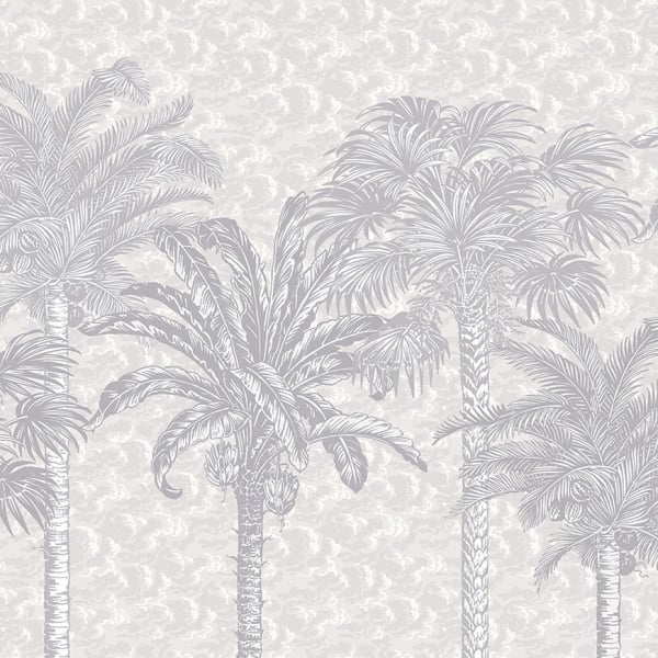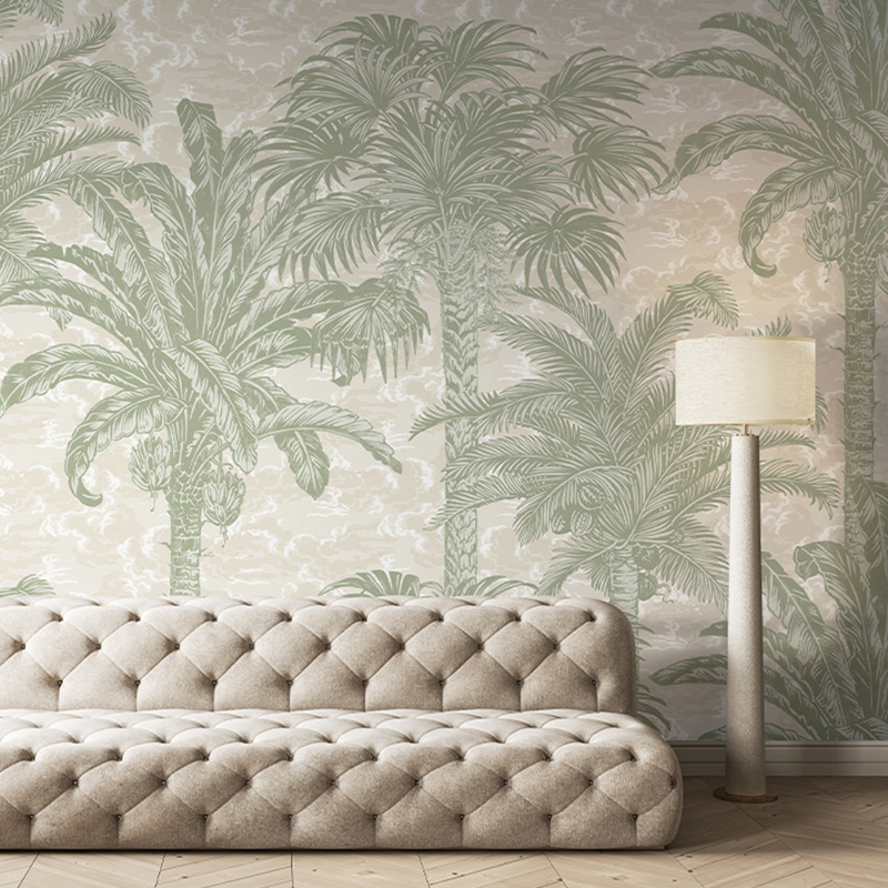La carta da parati panoramica Oasi presenta un motivo botanico tropicale, popolato da palme e banani. Gli alberi stilizzati si distinguono per i tronchi strutturati, il fogliame venato e i grappoli di frutti cesellati. Sullo sfondo, un cielo nuvoloso crea un respiro poetico e immaginario. Questo rivestimento firmato Code evoca una scena esotica e senza tempo.
