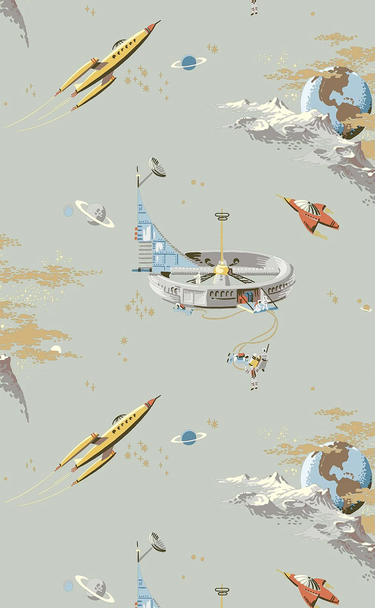 La carta da parati Space Adventure di Borastapeter mostra un motivo che rappresenta l'universo spaziale. Razzi, stazioni e capsule si dispiegano tra pianeti e forme celesti stilizzate. La decorazione mostra una scena di esplorazione lontana, dove le macchine gravitano in uno spazio strutturato e regolare. Il disegno, chiaro e meticoloso, compone una superficie grafica dal rendering preciso ed equilibrato.