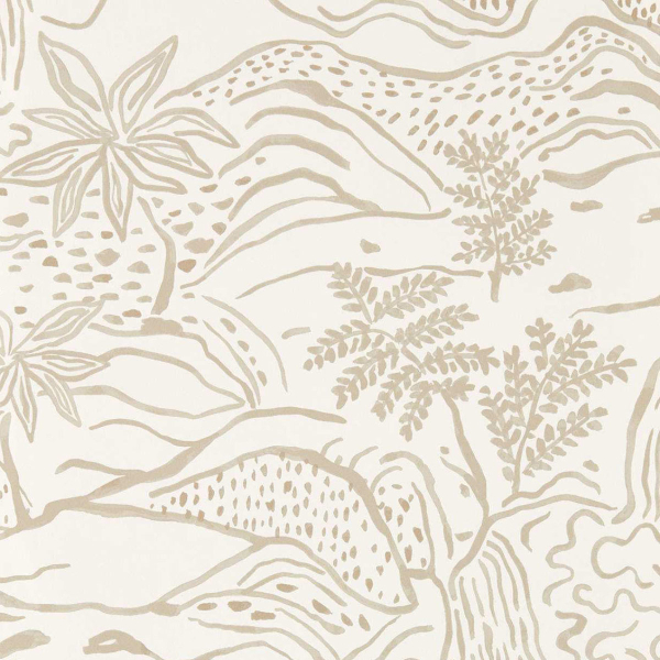 Ampie curve disegnano un motivo paesaggistico astratto sulla carta da parati Falling Foss di Scion. La scena alterna colline, punti, fiumi e vegetazione schematizzati in tinta unita. Ispirato a un disegno destinato a una tessitura jacquard, il decoro mostra una linea morbida e istintiva. Ogni elemento grafico è semplificato, lasciando intravedere alberi, rocce e rilievi in una composizione aperta ed equilibrata.