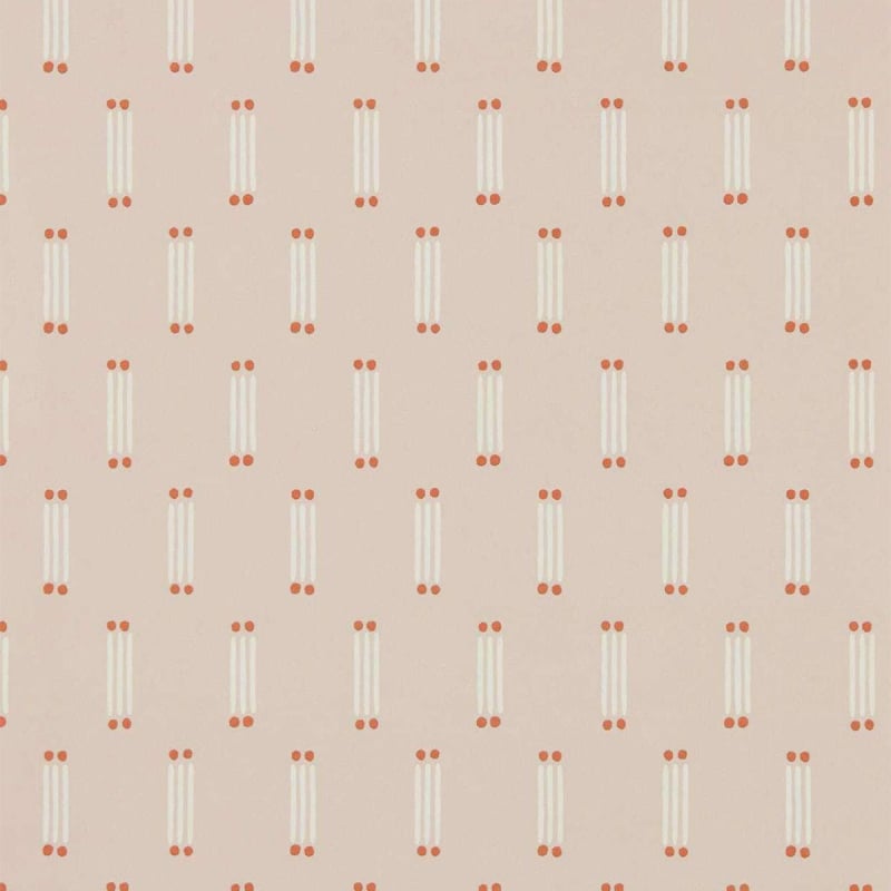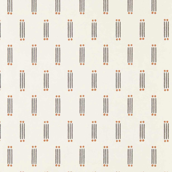 Una trama minimalista si dispiega sulla carta da parati Matchsticks, firmata Scion. Il motivo geometrico segue una disposizione regolare di figure verticali. Ogni elemento è costituito da tre linee parallele punteggiate da due piccoli punti circolari. Le forme ricordano dei fiammiferi congelati in un movimento semplice e grafico.