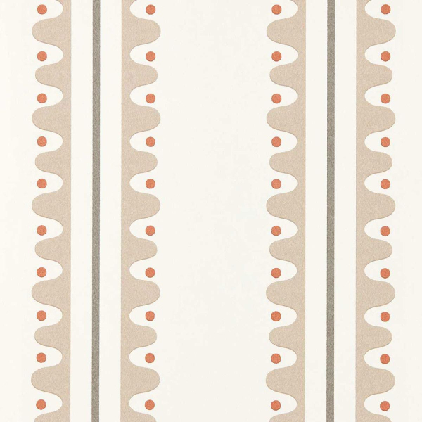 Oakham è una carta da parati creata da Scion. Il suo motivo geometrico presenta un'alternanza di bande verticali composte da una forma ondulata regolare, punteggiata da piccoli punti circolari. Questi ultimi sono perfettamente allineati al centro delle curve, creando un ritmo fluido e strutturato. La decorazione, ispirata a un lavoro di cremagliera, riprende una disposizione lineare su larga scala, in una composizione ripetitiva e ordinata.