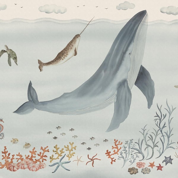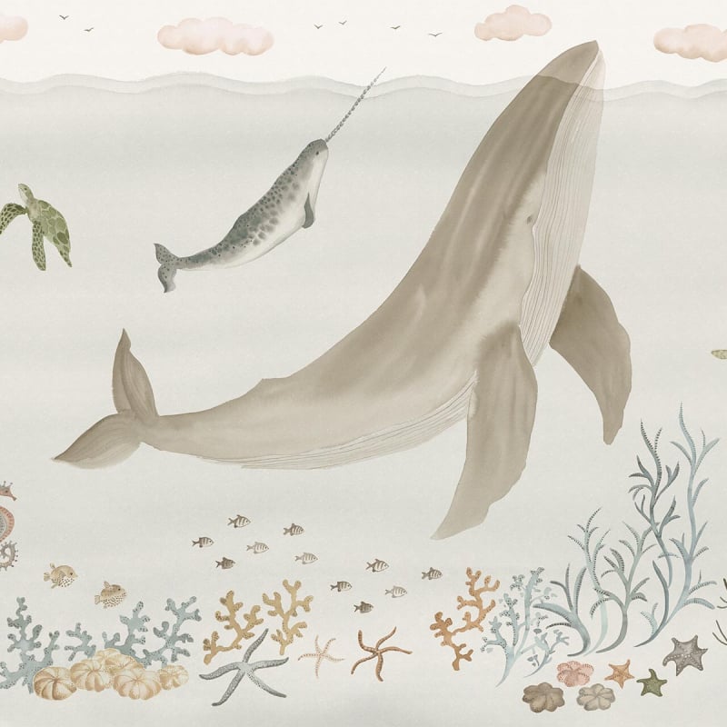 Un mondo marino immaginario prende forma sulla carta da parati panoramica Sally. Una balena, un narvalo e delle tartarughe si muovono tra meduse, cavallucci marini, coralli e alghe danzanti, in una dolcezza grafica. Il motivo illustrativo compone una scena onirica che favorisce la fantasticheria. Sandberg propone un affresco ritmato, per un'atmosfera al tempo stesso pacifica e giocosa.