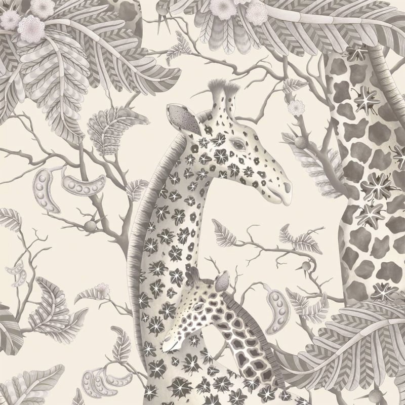 Royal Giraffe, una carta da parati di Cole and Son, sfoggia un motivo vegetale e animalier di grande finezza. Una giraffa e il suo piccolo condividono un momento di tenerezza tra acacie e baccelli delicatamente lavorati. La scena seduce con la poesia dei suoi dettagli e l'equilibrio tra naturalismo e immaginazione. Questo rivestimento si distingue per la densità grafica del disegno.