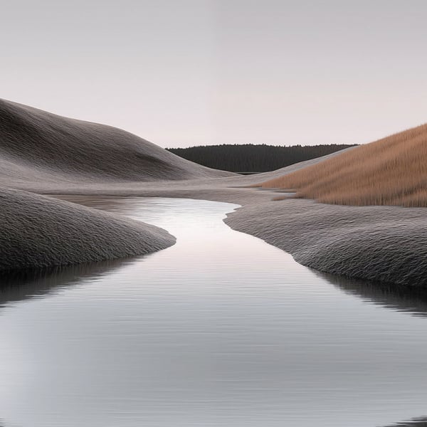 La carta da parati panoramica Golden hour di Londonart raffigura un paesaggio stilizzato con curve morbide e trame ovattate. Il motivo suggerisce colline dalle forme fluide che costeggiano un fiume scintillante, in un'atmosfera silenziosa. Il disegno mostra un rilievo irregolare, vicino al materiale pittorico. Ogni elemento compone una visione contemplativa, tra astrazione e natura reinventata.