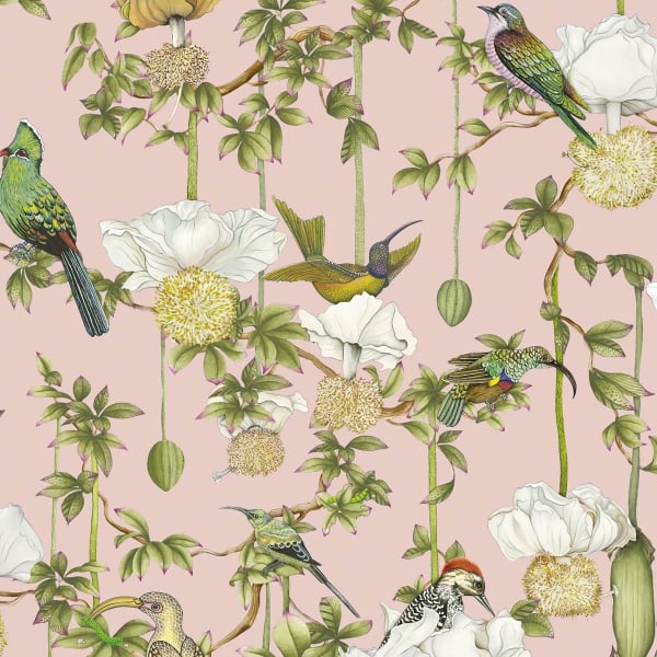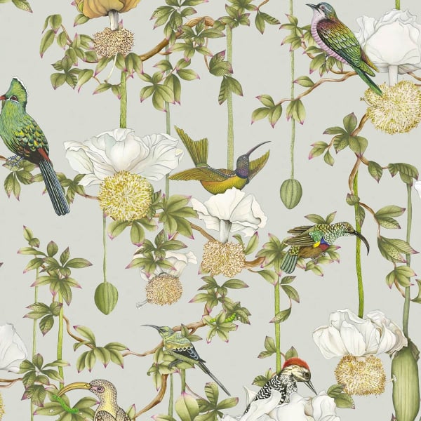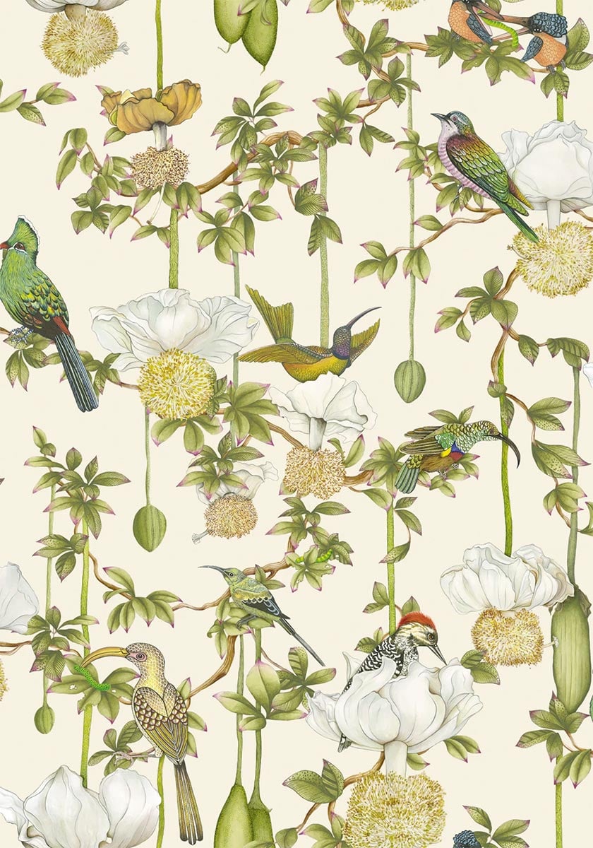 Una proliferazione di foglie nervate, steli snelli e fiori sbocciati compone la carta da parati Baobab Botanica. Uccelli tropicali dalle sagome più svariate prendono vita tra le liane, come un affresco vivente. Il motivo botanico si dispiega in una verticalità avvolgente, orchestrando un giardino pensile dagli accenti esotici. Cole and Son iscrive in questo modello la ricchezza grafica di una natura idealizzata.