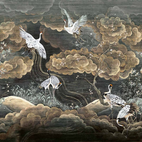 La carta da parati Byobu di Masureel presenta un motivo grafico ispirato al Giappone. Su un vasto panorama, gru e volute fluttuano tra i rami e le nuvole in un equilibrio poetico. Questa decorazione murale strutturata cattura un'atmosfera di natura in movimento e seduce con la sua resa delicata. Il tutto evoca l'arte e il viaggio con una profondità visiva singolare.