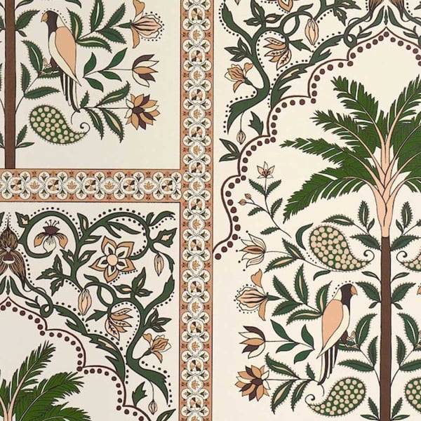 La carta da parati Amazonas Mystique di Schumacher presenta un affresco botanico. Palme stilizzate, uccelli esotici e arabeschi floreali si intrecciano in una cornice ritmata sulla superficie. Il motivo tropicale evoca un'ispirazione lontana alle stampe indiane, amplificata da una rete decorativa strutturata. Il tutto crea un'atmosfera vibrante, rigogliosa, evocativa di una giungla lussureggiante e incantata.