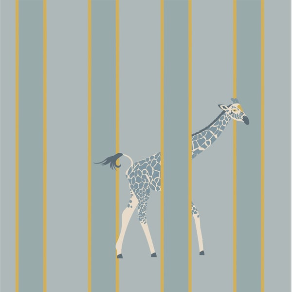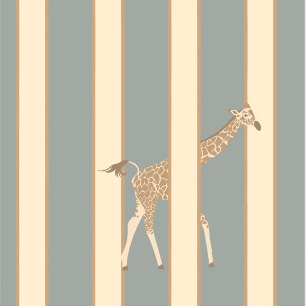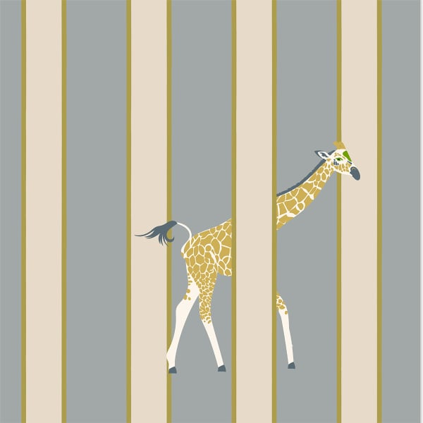 Little Cabari firma Gigi, una carta da parati in cui le righe si aprono su una scena di savana stilizzata. Tra le linee verticali, giraffe slanciate si insinuano con grazia silenziosa. Il motivo coniuga rigore grafico e leggerezza animale. Infonde un respiro onirico all'universo murale e invita a un sogno sottile, sospeso tra ordine e libertà.