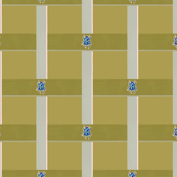 La carta da parati Scara di Little Cabari delinea una composizione giocosa con rigore grafico. Ampie piastrelle strutturano lo spazio, tra linee verticali e orizzontali di spessore variabile. All'incrocio di alcuni segmenti, uno scarabeo disegnato con delicatezza introduce un tocco inaspettato. Il tutto evoca un gioco di architettura vivente, dove il motivo si organizza in ritmo.