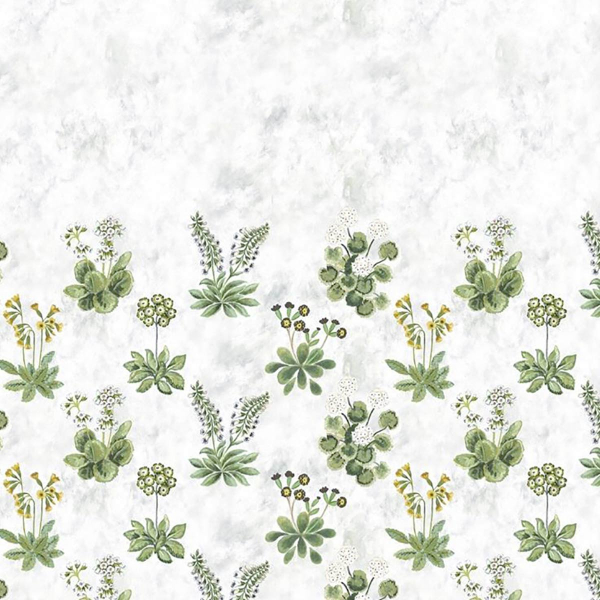 Primevère di Designers Guild è una carta da parati panoramica con un delicato motivo floreale. Mazzi di primule e auricole si dispiegano in un fregio nella parte inferiore, per poi diramarsi con regolarità. Il disegno preciso evoca un erbario botanico ordinato. Ogni composizione si distingue su uno sfondo patinato, sottilmente nuvoloso, che crea una profondità ovattata.