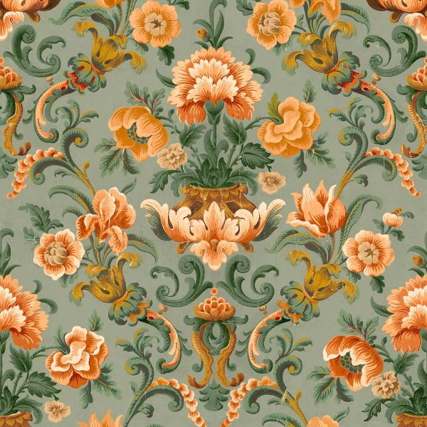 La carta da parati Aranjuez Damask presenta un motivo floreale di ispirazione damascata, strutturato da una composizione simmetrica incentrata su un vaso. Peonie e tulipani stilizzati si dispiegano con ampiezza, circondati da motivi a foglia di quercia che si incurvano in morbidi arabeschi. Firmata Coordonné, questa composizione organizza palmette e fogliame in un intreccio preciso che anima la superficie.