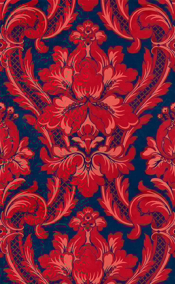 Venetian Damask, una carta da parati di Coordonné, si distingue per il suo motivo floreale di ispirazione barocca. Una composizione ampia e rigorosamente simmetrica si articola attorno a una maestosa corolla, che dispiega palme, volute e ampie foglie dalle curve generose. L’insieme segue un asse verticale discretamente scandito da uno sfondo a quadretti che approfondisce la prospettiva e struttura lo sguardo. Dal contorno morbido dei petali alle arabesche tracciate con minuzia, ogni linea densifica la decorazione e conferisce alla parete una presenza vibrante.