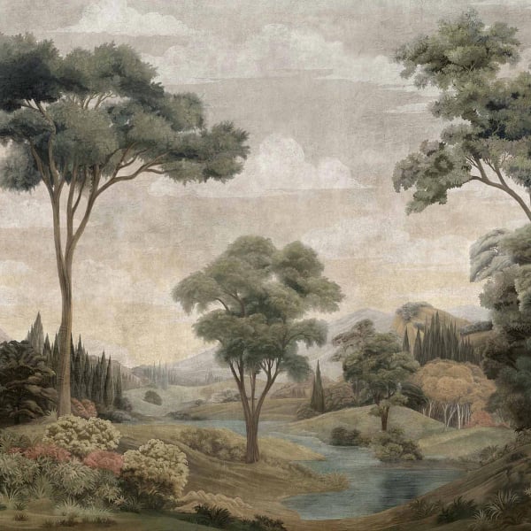 La carta da parati panoramica Silk Route del marchio Coordonné svela un paesaggio ispirato a scenari classici. Alberi alti e slanciati strutturano il primo piano e guidano lo sguardo verso una valle dai rilievi morbidi, attraversata da un fiume tranquillo. Sullo sfondo si profilano colline vaporose, cipressi slanciati e boschetti fitti, che creano un sottile gioco di profondità. L’insieme ricorda un antico affresco in cui la natura, disegnata con cura, compone un orizzonte silenzioso e contemplativo.