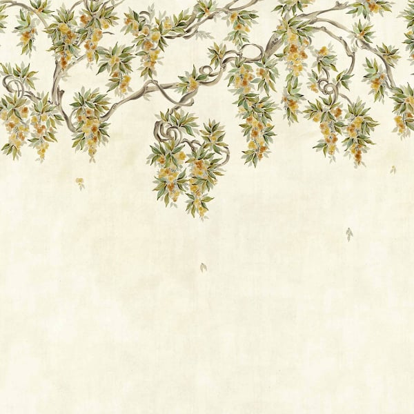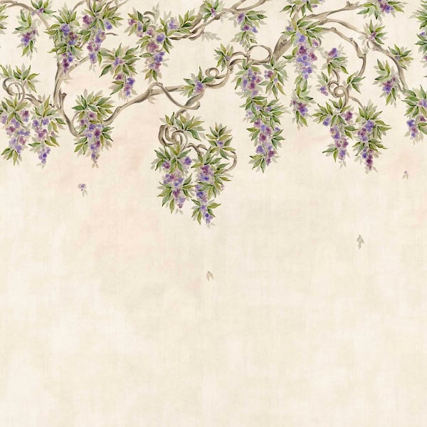 Abril è una carta da parati panoramica di Coordonné, in cui rami sinuosi si dispiegano su uno sfondo patinato. Delicati grappoli di fiori pendono a cascata, circondati da un fogliame finemente disegnato che anima la superficie. Il tratto ricorda un dipinto a mano, con contorni sfumati e una composizione ariosa. L’insieme crea una scena vegetale sospesa, in cui lo sguardo si sposta tra arabeschi e fiori.