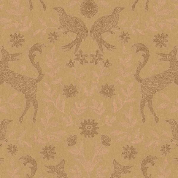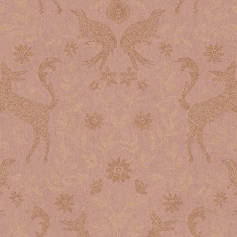 Eijffinger firma Fable, una carta da parati dal motivo figurativo in cui animali stilizzati prendono vita al centro di una composizione simmetrica. Gli uccelli spiegano le ali tra creature chimeriche dalle sagome finemente disegnate. Si muovono circondati da fiori radiosi e da fogliame delicato dai tratti minuziosi. La decorazione precisa forma un fitto ritmo ornamentale, attraversato da un immaginario narrativo.