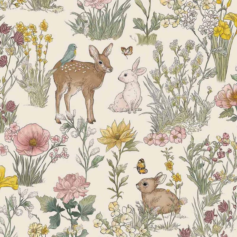 Eijffinger presenta Wonderland, una carta da parati dal motivo campestre popolato da animali e fiori di campo. Un capriolo si erge tra l’erba, mentre un coniglio e un uccello animano la scena con la loro presenza serena. Intorno a loro, steli sottili e corolle dettagliate compongono uno scenario rigoglioso. Il disegno preciso struttura l’insieme e inserisce la parete in una narrazione bucolica.