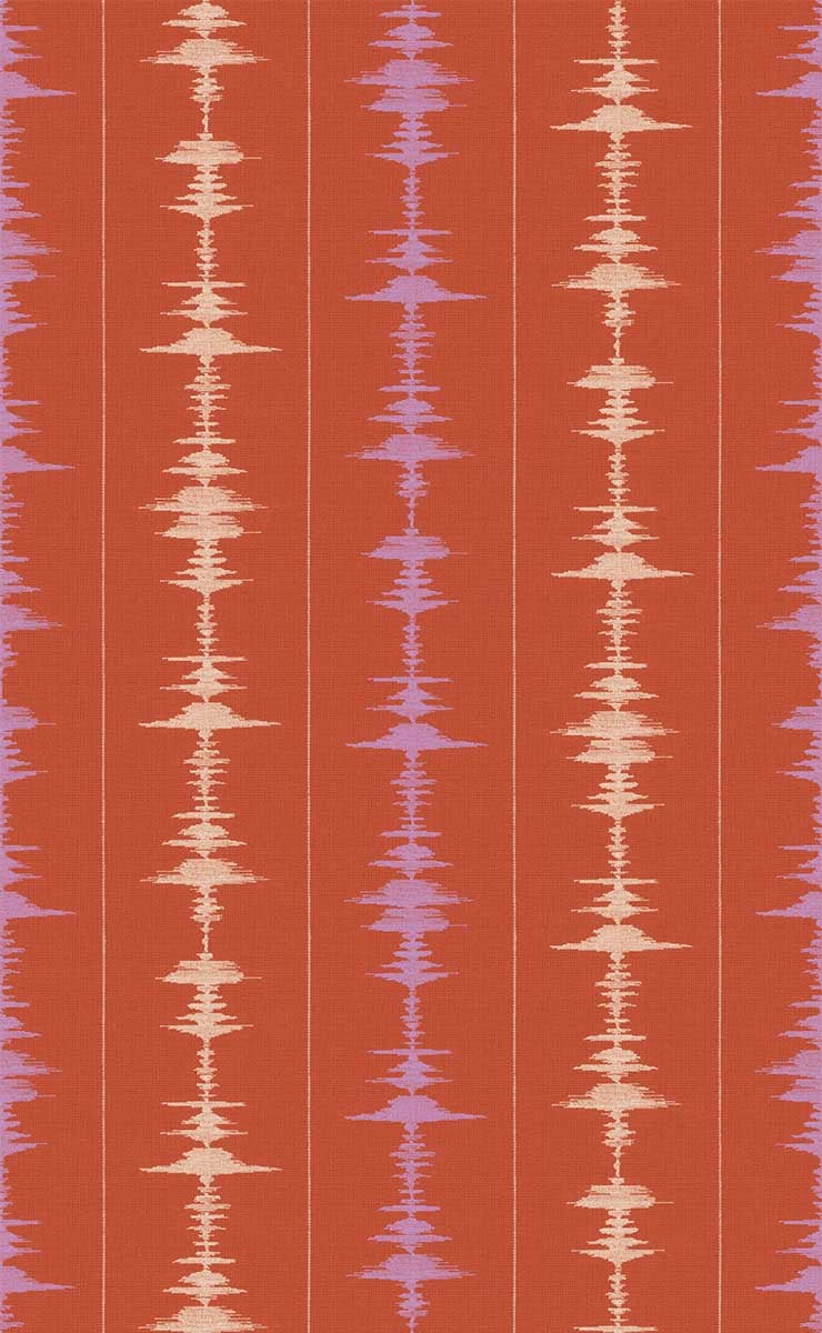 Vibes di Tres Tintas Barcelona è una carta da parati dal motivo geometrico strutturato da ampie strisce verticali. Il disegno evoca partiture astratte, nate dal linguaggio acustico delle città e trascritte in ritmi visivi. Forme simmetriche vibrano come onde grafiche, mentre le figure centrali si dispiegano in echi successivi. La superficie della parete si trasforma in una trama ritmata, attraversata da un’energia controllata.