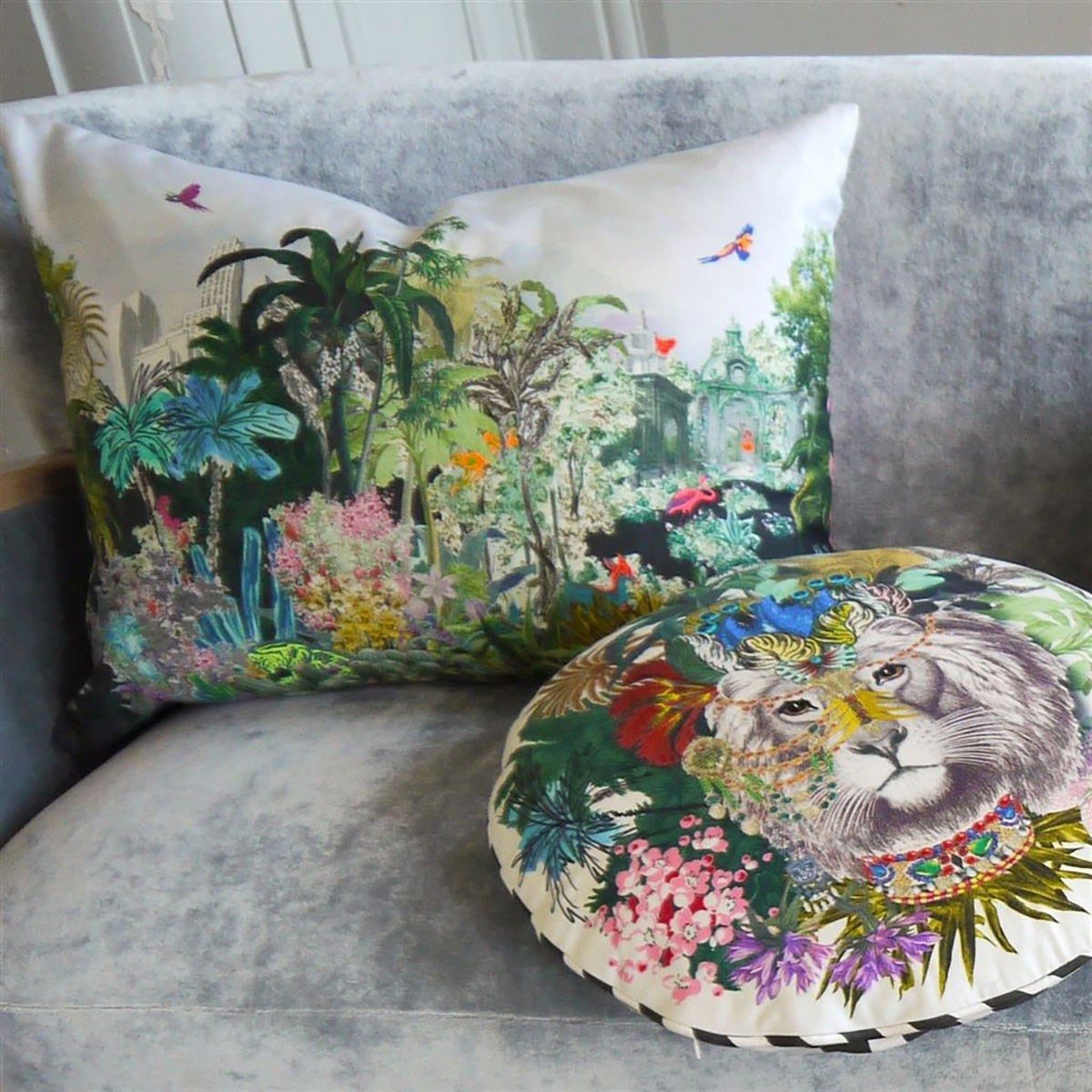 Jungle King è un cuscino rotondo disegnato da Sacha Walckoff per Christian Lacroix. Il motivo è il ritratto di un leone ornato con gioielli di piume, metallo e foglie tropicali. Tocchi di ricamo esaltano i dettagli più belli. La parte posteriore è realizzata con un motivo a strisce bianche e nere. Un bordino impreziosisce il tutto. Questo oggetto apporta un tocco di maestosità e malizia ai tuoi interni.