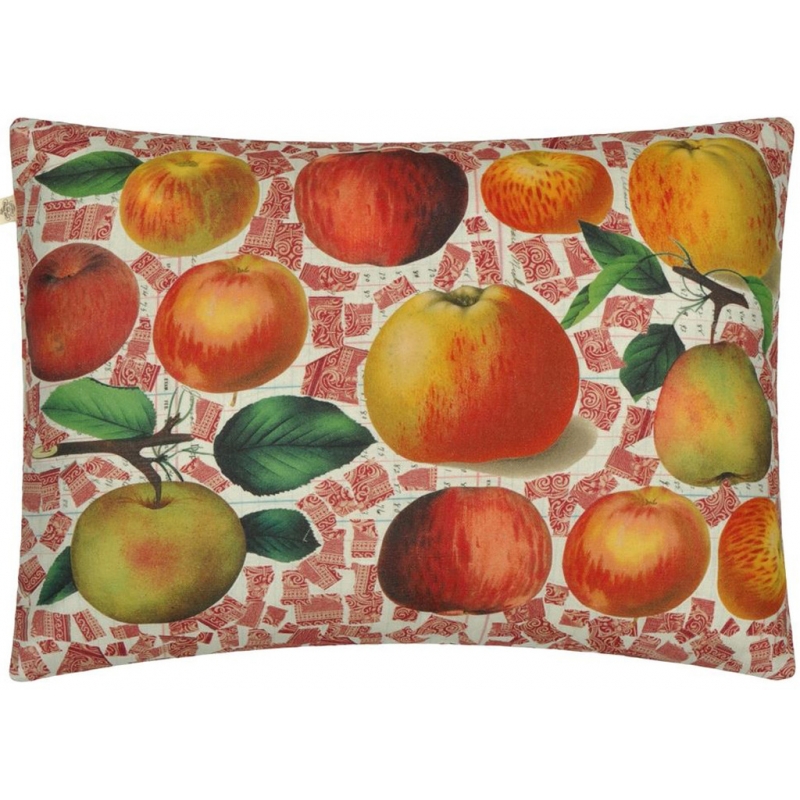 John Derian propone un cuscino rettangolare il cui motivo rappresenta mele su uno sfondo di mosaici color arancio corallo che continua sul retro. Il disegno è stampato digitalmente su un misto lino e cotone.