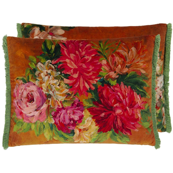 Fleurs d'Artistes, un cuscino in velluto di Designers Guild, ricorda i giardini di una volta con il suo bouquet di dalie e rose. La parte anteriore presenta i fiori al centro, mentre la parte posteriore li presenta agli angoli. Le figure, arricchite da un nastro di frange, ispirano gioia di vivere con i loro colori vivaci.