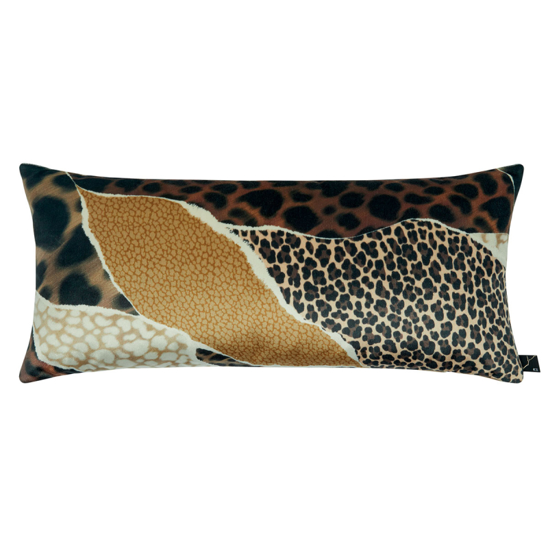 Il cuscino rettangolare Doubutsu Gara celebra il motivo animale con un patchwork di pellicce. Il designer Kenzo Takada mette in risalto le rosette leopardate, disponibili in diverse tonalità e formati. Queste figure, stampate su velluto opaco, evocano la nostalgia degli anni '50. Contrastano con il retro monocromatico, decorato con le onde stilizzate del logo K3.