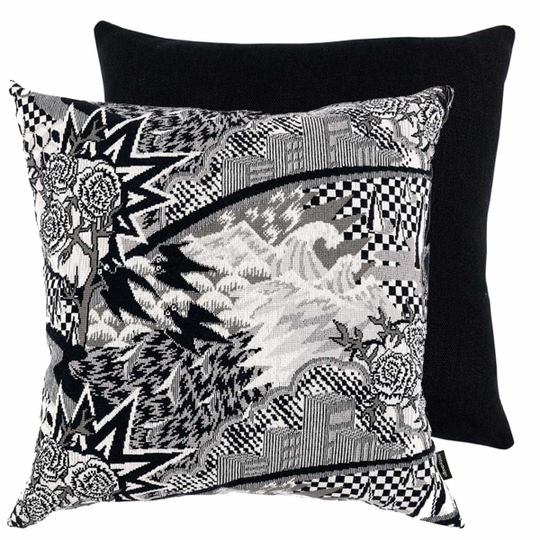 Sul cuscino Graphic Fairytale, un motivo grafico narrativo delinea paesaggi onirici e strutture urbane stilizzate. Linee esplose, montagne fratturate e fiori schematici si dispiegano sul fronte. Il retro in lino tinto in filo a tinta unita contrasta con la ricchezza del disegno. Questo arredo rivela il know-how di Kirkby Design in collaborazione con Eley Kishimoto.