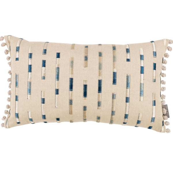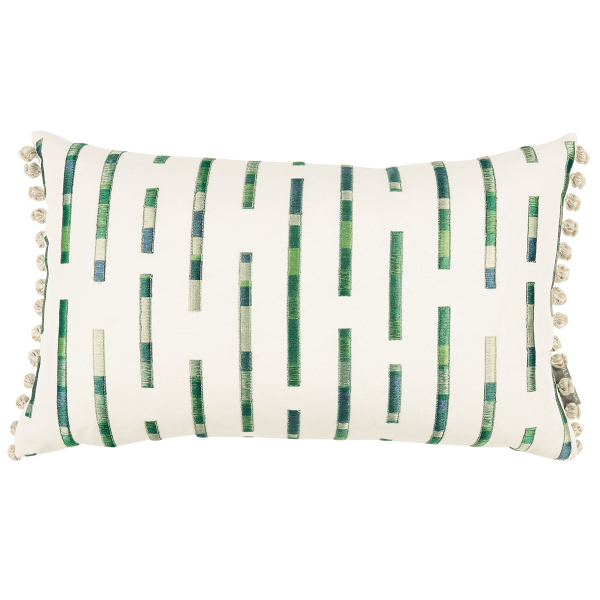 Elwood è un cuscino rettangolare con un motivo geometrico, composto da linee verticali ricamate di lunghezze irregolari. Queste righe frammentate, dalle sfumature contrastanti, creano un ritmo grafico su una base parzialmente in cotone. La finitura con pompon discreti sui lati accentua il fascino visivo. Firmato Villa Nova, questo pezzo equilibra rigore strutturato e morbidezza tessile.
