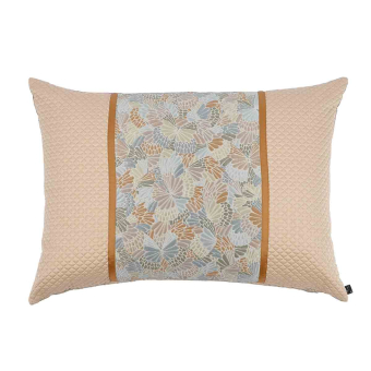 Il cuscino Irou di K3 Design by Kenzo Takada presenta un motivo vegetale stilizzato. Foglie grafiche, disposte con cura, compongono una scena centrale dalle linee morbide e dalle trame sfumate. Due pannelli uniti incorniciano questo quadro tessile e rafforzano il contrasto visivo. Questo decoro rettangolare suggerisce una natura reinventata, animata da una profondità rilassante.