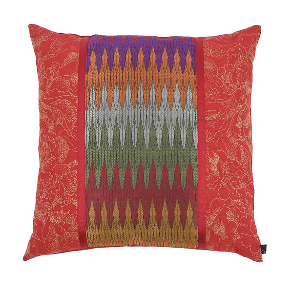 Il cuscino Misono combina un audace motivo geometrico con un opulento sfondo di ispirazione floreale. Un'ampia fascia centrale, strutturata come un fregio di punte intrecciate, scandisce la composizione. Il contrasto tra rigore grafico e abbondante decorazione rivela la sensibilità del disegno. Questo modello firmato K3 design by Kenzo Takada evoca il movimento stilizzato di una tessitura tradizionale.