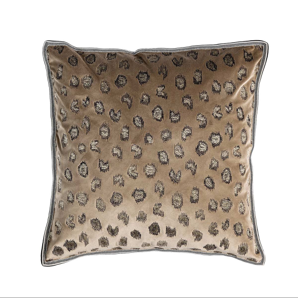 Il cuscino Daim di La Maison Casamance sfoggia un motivo geometrico che evoca il manto di un felino. Le impronte irregolari dai contorni sfumati conferiscono alla superficie un aspetto singolare. Il ricamo spicca su un materiale dalla texture vellutata, morbido e denso al tatto. Sul retro, un lino naturale a tinta unita dialoga con un bordo a gallone che incornicia l'insieme con precisione.