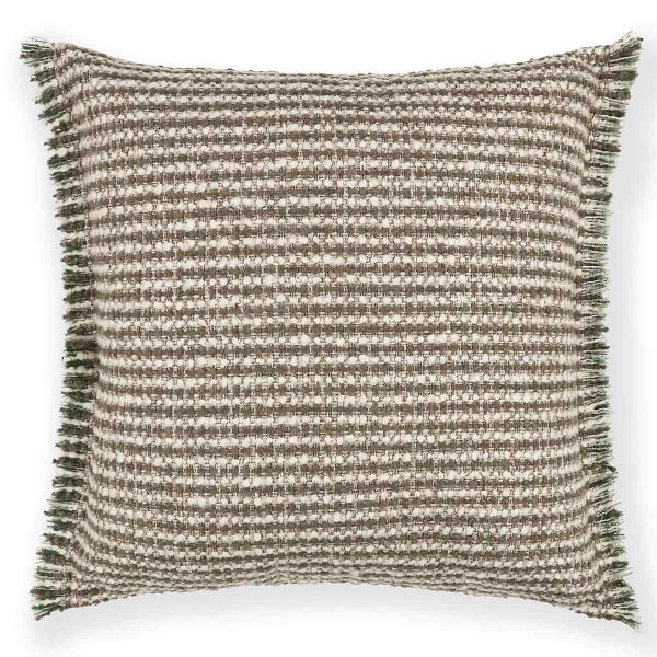 Il cuscino Koa firmato Romo presenta una trama fitta in cui i fili ricci incontrano texture fantasia. Questo modello dal motivo geometrico a righe seduce per l'irregolarità controllata della sua trama. Un bordo sfrangiato prolunga il rilievo del tessuto e ne traccia i contorni con discrezione. Il materiale rivela una sorprendente morbidezza al tatto, delicatamente inaspettata.