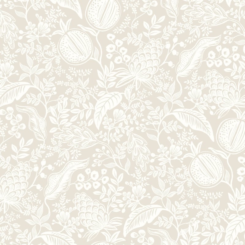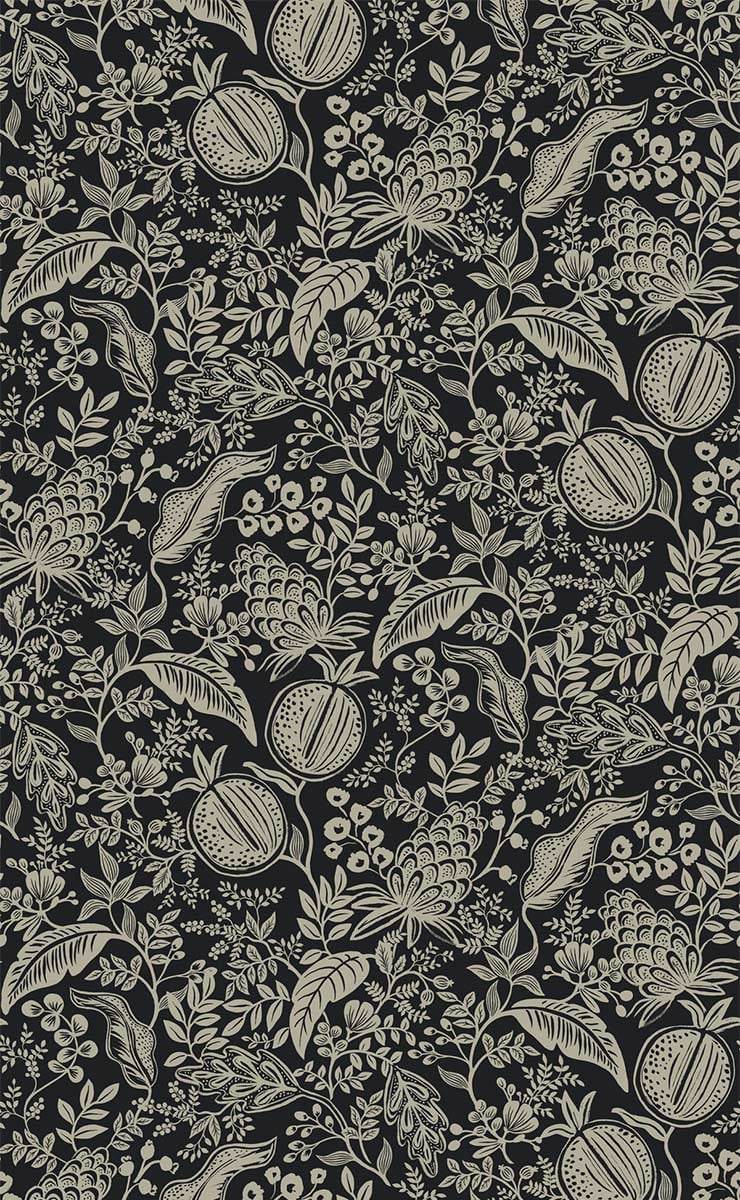 Succulenti melograni nel fogliame tropicale formano questo motivo bicolore, a volte metallico. Classica e moderna allo stesso tempo, con fondo scuro o luminoso, questa carta da parati Rifle Paper Co. veste senza tempo ogni spazio della casa.