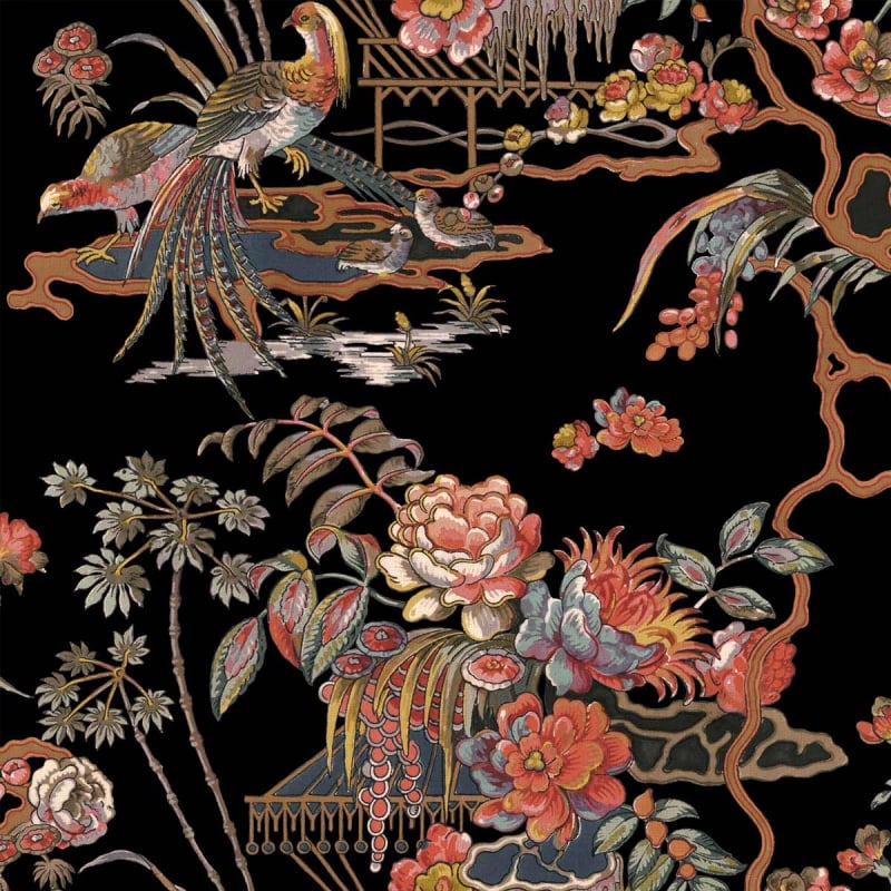 Il tessuto Sacred Pheasants, un modello in cotone disegnato da Coordonné, risveglia gli interni con i suoi colori energizzanti. Presenta un giardino cinese animato da una coppia di venerati fagiani e dai loro pulcini, su uno sfondo dai colori intensi. I fiori e il piumaggio dorato delle gallinacee ricordano le antiche lacche cinesi, fornendo così un arredamento tipicamente orientale.