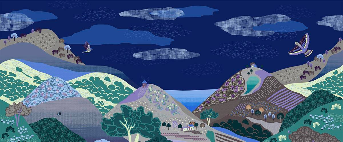 Fresque Évasion, una carta da parati di Maison Martin Morel, raffigura un paesaggio onirico dove valli, colline e uccelli in volo si incontrano in un'armonia poetica. Ogni dettaglio, minuziosamente disegnato, evoca una natura rilassante, arricchita da trame artistiche stilizzate. Questa creazione di Lily Alcaraz e Léa Berlier, più che un accessorio, è un invito al viaggio e al relax.