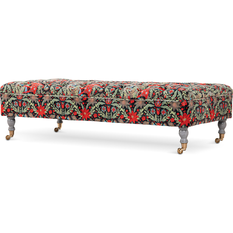 La seduta Der König Black Velvet presenta un motivo vegetale lussureggiante, composto da corolle circondate da steli sinuosi. Come un antico erbario, questo modello immaginato da Mindthegap mescola simmetria ed esuberanza. Ogni dettaglio è incarnato su un velluto di cotone, sinonimo di profondità e delicatezza. L'insieme poggia su piedini con rotelle dorate, punteggiati da rivetti decorativi.