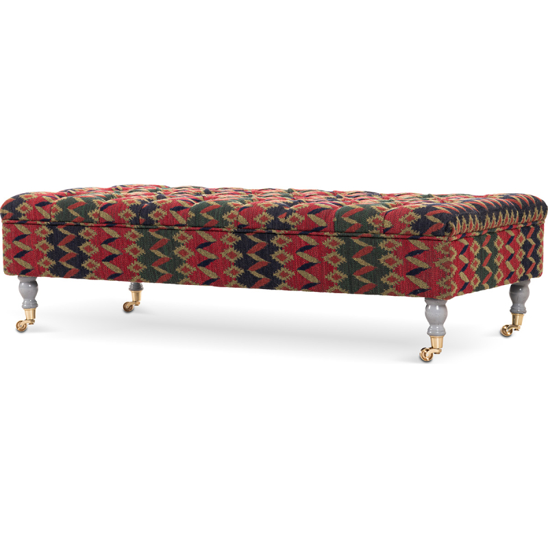 La seduta Cortina Fabric cattura l'attenzione grazie alla forza del suo audace motivo geometrico. La superficie, scandita da motivi a spina di pesce e forme angolari intrecciate, rivela uno spirito artigianale. L'equilibrio tra la struttura in legno, le ruote classiche e la tappezzeria precisa esprime l'approccio curato di Mindthegap. Si colloca in una linea sottile tra eredità tessile e design contemporaneo.