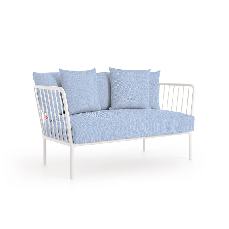 La seduta Arp Patio è un divano dal delicato design geometrico, firmato Diabla. La struttura in alluminio verniciato a polvere disegna aste verticali che formano lo schienale e i braccioli. La seduta e i cuscini dai contorni ipnotici presentano piccoli riquadri regolari che catturano lo sguardo. La maison propone un modello modellato da un gioco di linee e volumi.