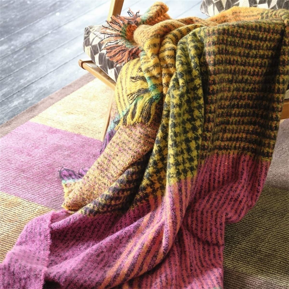 Pur imitando l'aspetto di una trama artigianale, un sontuoso disegno scozzese arricchisce il plaid Katan. Quest'ultimo mescola l'elegante pied de poule con righe sottili e classiche. Realizzato interamente in lana, questo modello offre una superficie piacevole al tatto.
