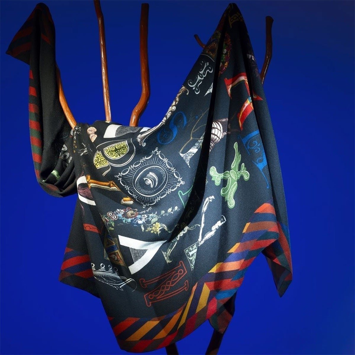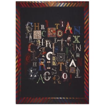 Realizzato in lana merino, il Do You Speak Lacroix? presenta una stampa grande, audace e multicolore. Evidenzia le grandi lettere che compongono il nome del designer francese Christian Lacroix. Ogni elemento decorato con dettagli ornamentali contrasta con lo sfondo scuro. Il tutto è incorniciato da strisce policrome.