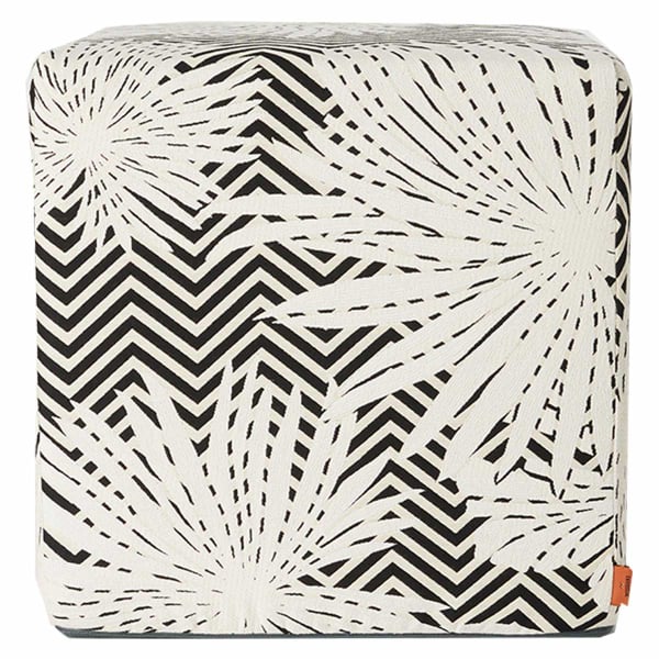 Il pouf Ombre Cube presenta un dialogo sorprendente tra motivi geometrici e floreali. Raggi astratti, simili a palme esplose, attraversano uno sfondo strutturato da chevron regolari. Il disegno gioca sulle sovrapposizioni e rivela una tensione visiva controllata. Questo arredo, ideato da Missoni Home, riflette la precisione di una composizione grafica ben riuscita.