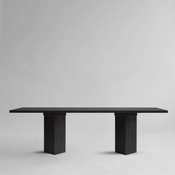 Uno stile al tempo stesso minimalista e scultoreo compone il tavolo da pranzo Arc, pubblicato da 101 Copenhagen. Il piano in rovere massiccio si distingue per la sua durata, la sua stabilità naturale e la ricchezza delle sue venature. Questa struttura poggia su gambe scanalate che richiamano l'architettura classica. Il pezzo incarna un approccio formale all'arredamento, tra equilibrio ed espressione.