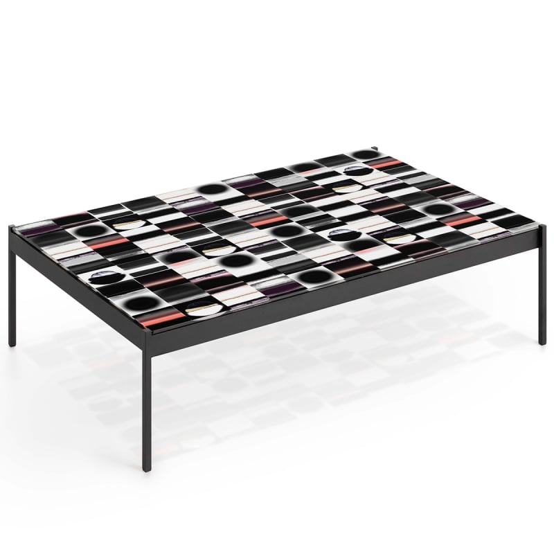 Il tavolino Stormy  Sunsets presenta un piano vibrante, composto da motivi grafici astratti. La superficie in vetro temperato vetrificato riflette la luce con sottigliezza e crea giochi di contrasto. La struttura in alluminio verniciato a polvere conferma una linea pulita, contemporanea e robusta. Firmato Gandia Blasco, questo modello evoca un linguaggio visivo controllato, tra arte e design armonioso.
