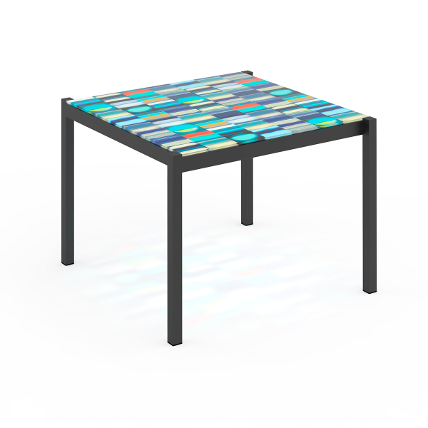Firmato Gandia Blasco, il tavolo da pranzo quadrato Cold Sunsets espone un motivo geometrico astratto. Rettangoli giustapposti in leggero rilievo compongono un disegno su un piano in vetro temperato che evoca un tramonto. La struttura, in alluminio verniciato a polvere, sostiene il tutto con rigore e contrasto. Questo modello gioca con la luce e la trama per creare una profondità visiva sorprendente.
