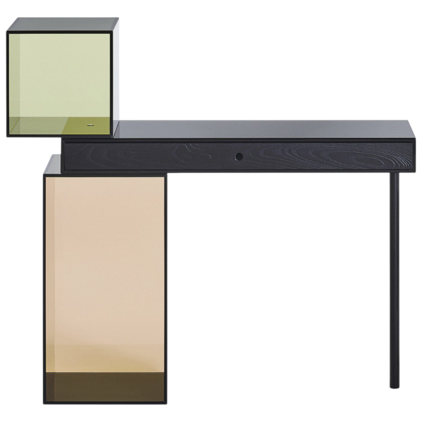 Realizzato da Glas Italia, il tavolo Ratio esplora l'equilibrio tra apparente leggerezza e tensione strutturale. Sottili elementi in vetro temperato fumé si innalzano a sbalzo, sovrapposti in una precisa sequenza geometrica. Sottili giunti in alluminio anodizzato ne coordinano discretamente l'assemblaggio. Una gamba laterale in frassino massello afferma la sua presenza con calma.