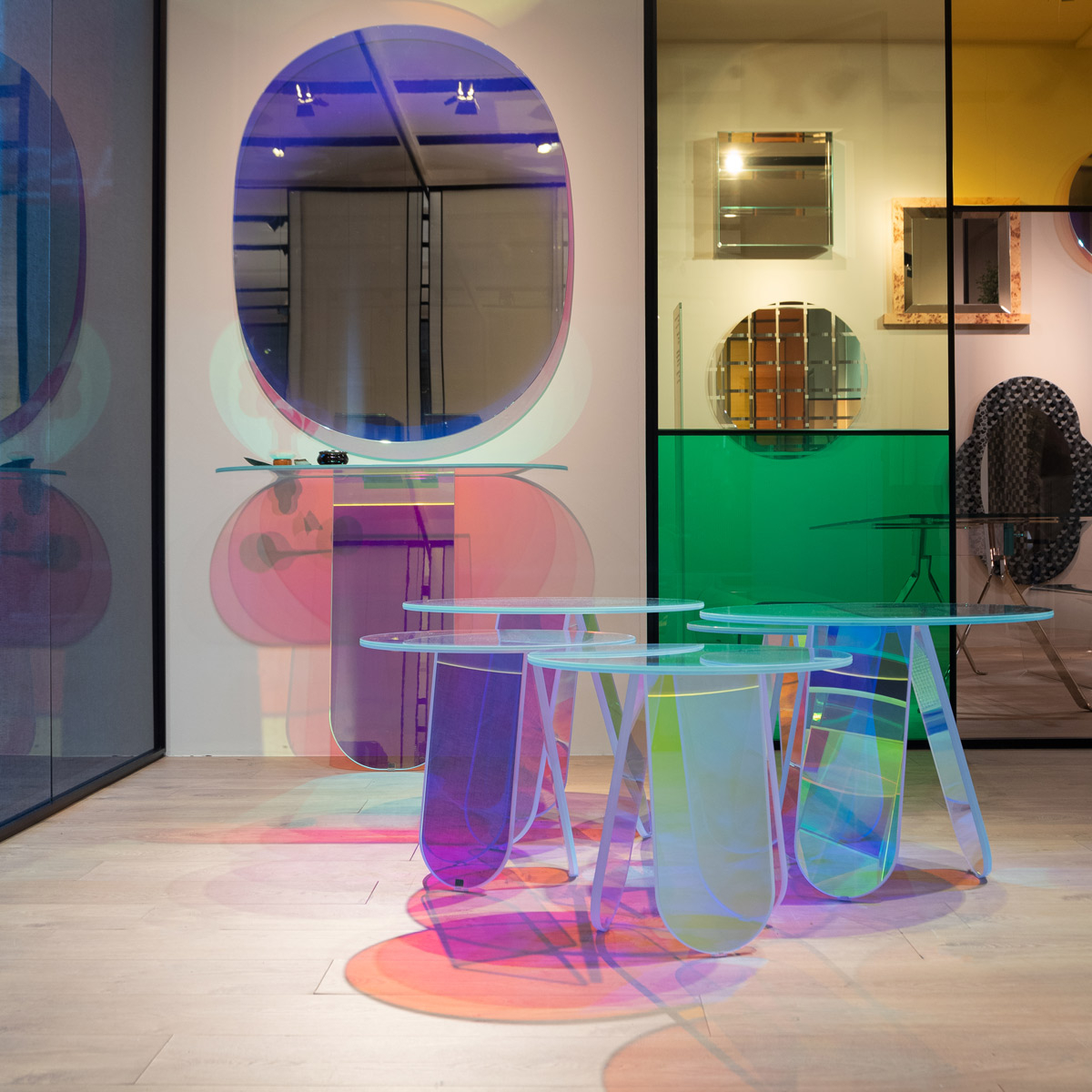 Realizzata da Glas Italia, la consolle Shimmer presenta una silhouette essenziale in vetro stratificato e incollato. La sua superficie iridescente, dai riflessi multicolori, si trasforma a seconda della luce e dello sguardo. Bagliori in movimento delineano una struttura quasi immateriale. L'insieme cattura la silenziosa stranezza di un miraggio, a metà strada tra illusione visiva e profondità tattile.